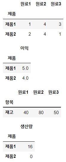 for j in range(len(df_m.columns)): #j: 원료 0,1,2 / i: 제품 0, 1