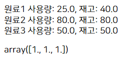 print(df_material.columns[i] + ' 사용량: ' +str(temp_sum) + ', 재고: ' + str(float(df_stock.iloc[0][i])))