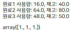 # 제약조건으로 규정한 '각 원료의 사용량'이 '재고를 효율적으로 이용하고 있는가'를 알아보자.