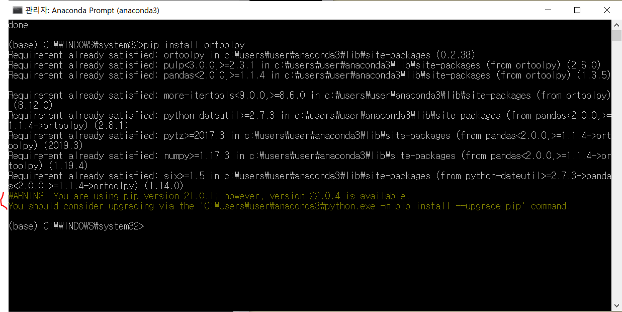 처음엔 내가 ortoolpy라는 라이브러리를 pip install ortoolpy로 설치하는게 아닌가? 싶어 ortoolpy 설치하는 법으로 열심히 검색했는데, 관리자 모드로 설치를 해보라고 하는 것이다. 근데 위에 내가 캡쳐한 사진이 관리자 모드로 설치했더니 오류가 난 거다.