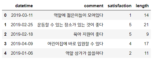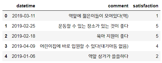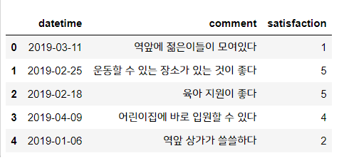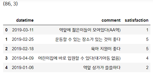 데이터는 비교적 간단한 데이터입니다. 고객이 남긴 의견과 날짜, 만족도 점수가 표시되어 있습니다.