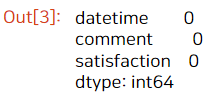 보통은 설문조사에서 의견(comment)은 선택사항이므로 비어있는 경우가 많습니다. 그런데 이 데이터의 고객님들은 잘 남겨주셨네요! 그래서 2개만 결측치가 존재합니다.